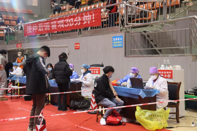 师生在志愿者和工作人员的引导下,依次测量体温、扫码入场,提交知情同意书,录入个人信息、接种疫苗、留观等待,直至顺利离场。接种工作总体平稳、安全、高效、有序,共计2758名师生完成加强针接种。