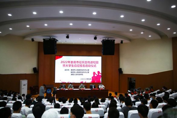 5月20日,2022年娄底市征兵宣传进校园暨大学生应征报名启动仪式在匠成楼报告厅举行。党委副书记李军林,娄底军分区副司令员段德学大校、动员处处长刘智勇上校、娄星区人民武装部政委张东友上校出席仪式,学校征兵领导小组成员单位主要负责人和全体征兵专干以及意向入伍学生300余人参加。仪式由武装部部长魏彦煜主持。