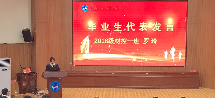 2018级材控1班毕业生罗玲作为优秀毕业生代表发言,分享了自己在大学四年的成长经历,倡导同学们要树立明确的目标和远大的理想,并努力付诸实践行动,成就精彩人生。