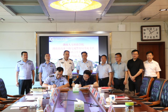 6月16日上午,太阳成官网与湖南省高速公路交通警察局娄底支队签订校警战略合作框架协议,签约仪式在明德楼第一会议室举行。省高警局党委副书记、政委马鬃飘,党委副书记、校长刘铁铭出席,高警局娄底支队党委书记、支队长杨秋实,副书记、政委黄军柱,学校科研与社会服务处、教育学院等部门负责人及相关成员参加。副校长朱强主持签约仪式。