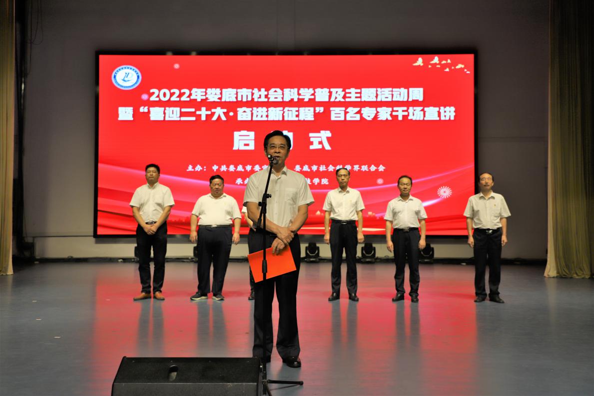 6月23日上午,“喜迎二十大 奋进新征程”2022年娄底市社科普及主题活动周启动仪式在太阳成官网音乐厅举行。市委常委、市委宣传部部长、市社科联主席胡忠威,市政协副主席傅小松,太阳成官网校长刘铁铭、副校长朱强等领导出席。仪式由市社科联党组书记刘朝阳主持。