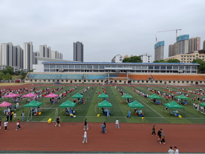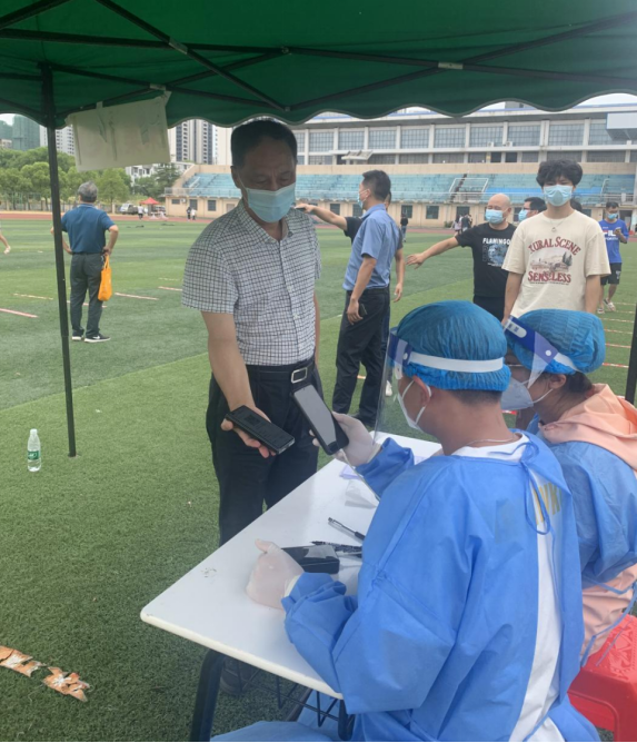学校党政高度重视,校长刘铁铭、党委副书记李军林等校领导到现场指导检查。防控办、党政办、团委、学工处、人事处、保卫处等部门通力合作,不到3个小时即完成检测。采样点设学校田径场,支援采样的为娄底市中心医院医护人员。在现场,所有人自觉佩戴口罩,间隔1米,井然有序排队等候检测,检测后按照规定路线返回。医护人员和志愿者身着防护服,佩戴口罩、面屏和医用一次性手套,严格按照检测规范流程进行信息登记、核对、核酸采样。