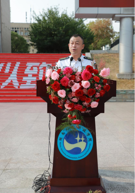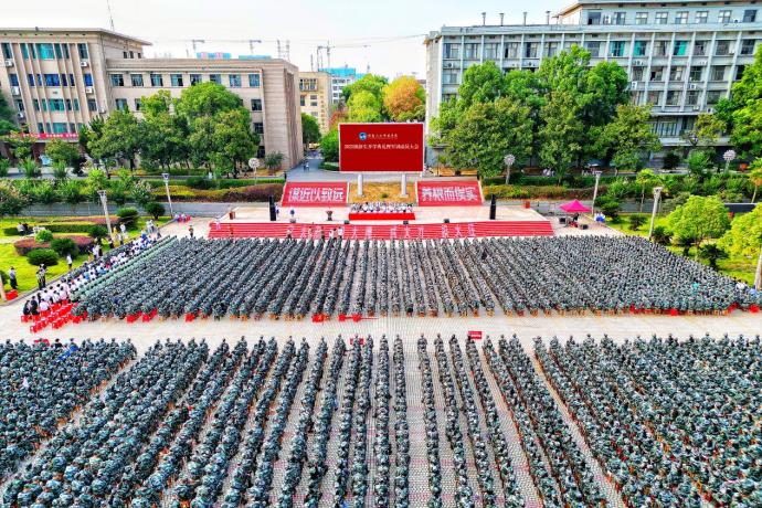 校长刘铁铭以“星光不问赶路人,历史属于奋进者”为题致辞,对新同学表示热烈欢迎和祝贺。他深情回顾了学校的发展历程,指出校园因为新生的到来增添了生机与活力。他强调,身处新时代的大学生是幸运的一代,更是需要担当作为的一代。铁铭校长对全体新生提出几点希望:一是希望同学们立鸿鹄志,怀强国愿;二是希望同学们学习新知识,练就真本领;三是希望同学们锤炼品德修为,塑造更好的自己。对于军训,铁铭校长希望全体新生保持昂扬的训练热情,努力克服困难,通过训练进一步提高思想政治觉悟,以坚韧不拔的顽强毅力和坚定信心圆满完成军训任务。