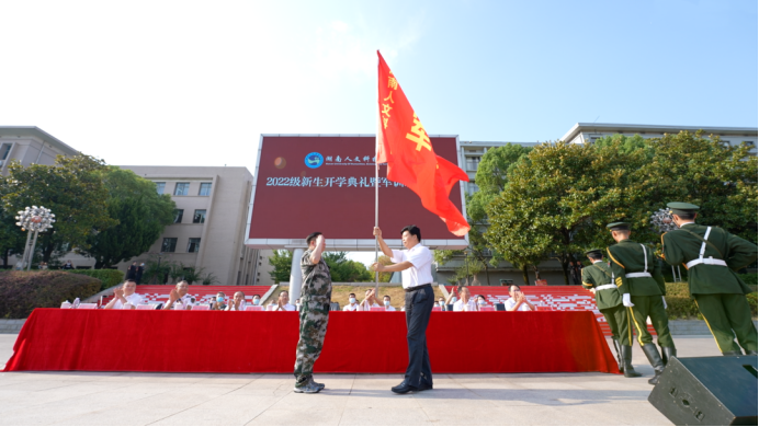 党委书记刘和云为军训团授旗,武装部部长、军训团团长魏彦煜接旗。