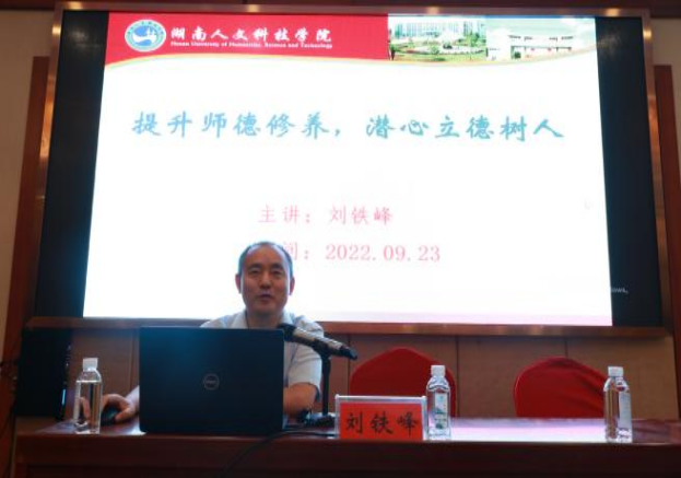 9月23日,副校长刘铁峰教授以“加强师德修养,坚持立德树人”为主题拉开了2022“国培计划”市级农村初中道德与法治课骨干教师研修班(A1027-1)线下培训的序幕。马克思主义学院部分教师及来自娄底市各区县的70名研修班学员参加了讲座。