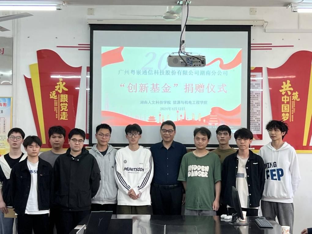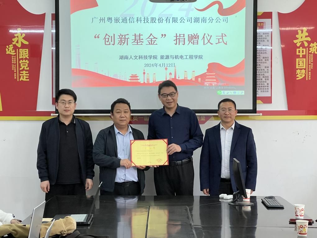4月12日下午,广州粤嵌通信科技股份有限公司湖南分公司“创新基金”捐赠仪式在同德楼306会议室举行。广州粤嵌通信科技股份有限公司湖南分公司总经理周阳,能源与机电工程学院院长胡东、副院长伍铁斌、副院长王舒及师生代表参加。仪式由伍铁斌主持。