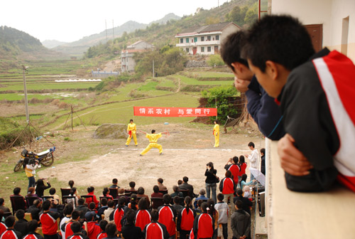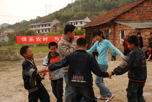 3月25日,体育系07级社体班全体同学在系领导、班主任带领下,在山青水秀的大科乡水洋村村活动中心举行了一场别开生面的慰问演出活动。简陋的舞台并未影响同学们激情表演,热烈奔放的健美操、刚劲矫健的武术、时尚动感的T台秀、朴实感人的话剧,并与水洋村小朋友积极互动……赢得了村民的热烈掌声。我系学生向村里留守儿童赠送了慰问金,并为当地困难户送去了生活用品,水洋村村委会也赠送 “心系山村、情义精神”的锦旗表示诚挚谢意,充分展示了44118太阳成城集团与水洋村人民的深厚情谊。