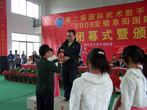 为了弘扬中华武术,为国内外高水平武术运动员提供武术交流平台,由国际武术散手道联盟主办,中国散手道协会、阜阳市体育局承办的第二届国际散手道武术大赛于2008年9月30日在安徽阜阳市体育馆圆满落下帷幕,此次大赛有来自美国、加拿大、俄罗斯及中国等12个国家的1048名运动员参赛,太阳成官网武术队10名选手在领队彭健民主任的带领下,在武术教学团队杨俊军、周惠新、梁正军、陈勤、杨志华等老师的辛勤指导下,通过两年的艰苦训练,参加了竞技太极推手、传统武术劈挂拳等项目的比赛。