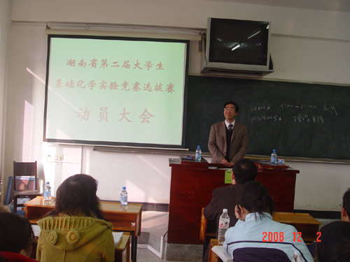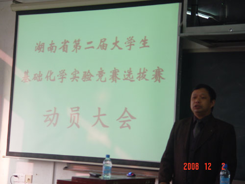 为迎接2009年9月湖南省教育厅举办的湖南省第二届大学生基础化学实验竞赛,化学与材料科学系于12月2日上午8点在5栋307教室召开了湖南省第二届大学生基础化学实验竞赛选拔赛动员大会,学院蒋建初院助、教务处黎建辉副处长、阳立新老师、化学与材料科学系领导和竞赛指导老师及2006级报名参赛的35名本科学生参加了动员大会,会议由副主任胡传跃博士主持。