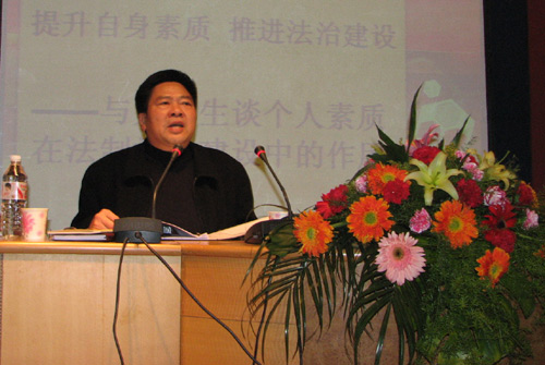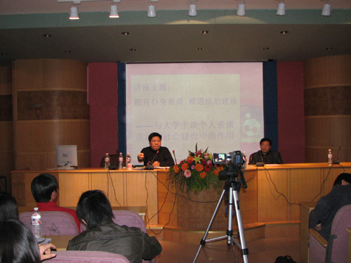 刘局长在题为“提升自身素质,推进法治建设——与大学生谈个人素质在法制社会建设中的作用”的讲座中,深刻阐述了法治与德治的关系及个人素质在法治建设中的积极作用,并从立志、修身、践行、博学等四个方面对个人素质的提高进行了全面深入地剖析。他激励同学们:大学只是加油站不是保险箱;面对严峻的就业形势,应该更夯实专业知识,时刻准备迎接机遇和挑战。
