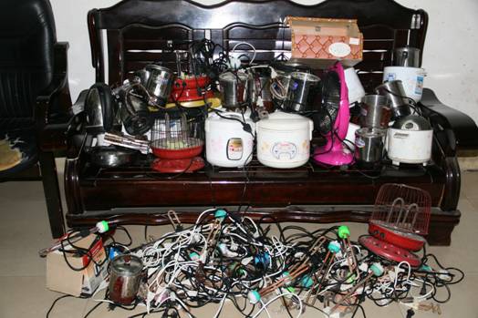 12 月 15 日 晚,由学工处、武保处对全校20栋学生宿舍进行了地毯式的消防安全隐患大排查,共收缴电饭煲9个,热得快100多根,电热杯20多个,酒精炉2个,电烤炉3个,管制刀具10多把。