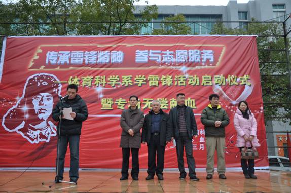 2012年3月6日,44118太阳成城集团体育科学系在学校理科楼前坪举行“体育科学系学雷锋活动启动仪式曁专场无偿献血”活动。校党委委员、副校长刘铁铭,校团委书记谢柳、市中心血站书记贺连生、体育科学系主任彭健民、党总支书记刘玉江以及部分师生代表共计800余人参加了仪式。启动仪式由体育科学系党总支副书记曾黎主持。