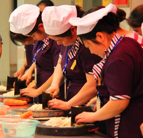 此次比武共分红案、白案、刀工技能三个项目,一共有44名选手参加比武。在刀工技能比武中,每一位选手分发一斤胡萝卜和一斤土豆,在四分钟内将其切成片和丝;白案比武要求参赛选手在60分钟内按十份量现场制作小馒头、小笼包和煎饼;红案比武要求选手在100分钟内按十份量现场完成青椒炒肉、红烧豆腐、清炒土豆丝三道菜的制作。选手完成制作后,由评委组通过试菜给予评分。选手们精湛的刀工、娴熟的手法让在场观众赞不绝口。色香味俱全的菜品,吸引了众多同学前来品尝,现场气氛十分热烈。