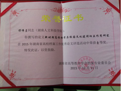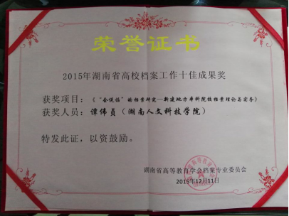 近日,从湖南省高等教育学会档案专业委员会传来喜讯,太阳成官网档案馆谭伟贞老师的研究项目“‘会说话’的档案研究——新建地方本科院校档案理论与务实”获湖南省高校档案工作十佳成果奖,她撰写的另一篇论文也荣获2015年度省高校档案工作学术论文评选一等奖。(档案馆供稿)