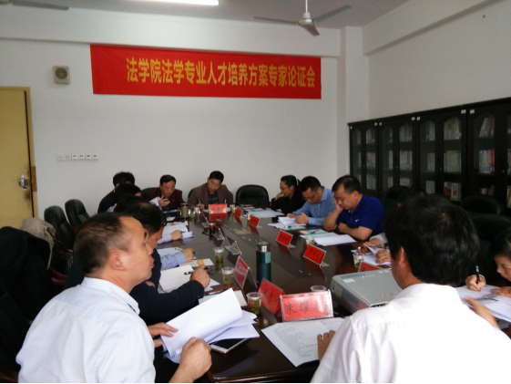 5月24日下午,法学院在致远楼308会议室举行了2016版人才培养方案论证会。出席会议的指导专家有娄底中院民一庭庭长郭超群、娄星区法院政治部主任刘继红、市检察院政策研究室副主任唐燕、娄底人和人律师事务所主任罗伯武、副校长周发明、纪委书记杨鑫铨、产学研中心主任黎建辉。法学院党政领导、法学专业部分教师参加了本次会议,会议由院长朱耀斌教授主持。