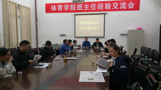 11月1日下午三点半,体育学院班主任工作经验交流会在体育馆会议室隆重召开。本次交流会是在体育学院全面推进学生管理工作的同时,为了进一步加强班主任队伍,提升广大班主任对学生管理工作重要性的认识,提升班主任的工作水平而召开的一次重要会议。党总支书记蒋毅,副书记谢嘉,全体辅导员和班主任老师参加了此次会议。