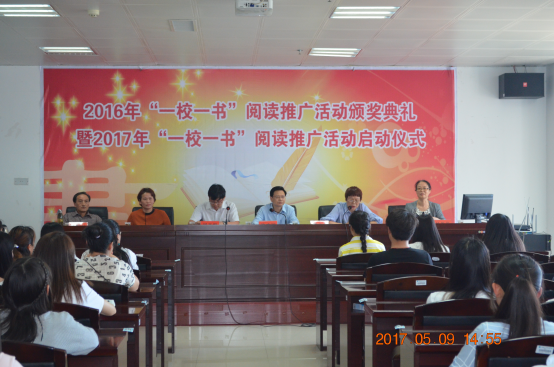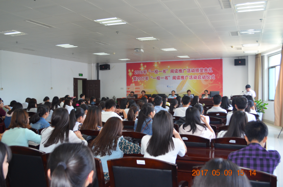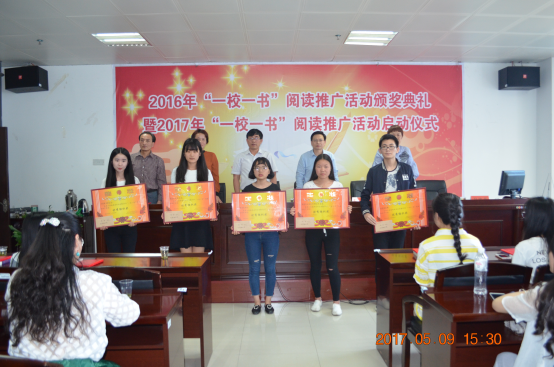 5月9日下午,2016年“一校一书”阅读推广活动颁奖典礼暨2017年“一校一书”启动仪式在图书馆415学术交流中心隆重举行。仪式由图书馆党总支书记夏永全主持,副校长陈志国、图书馆和宣传部的部门负责人、各学院团总支书记、部分社团负责人,获奖的老师和学生共计100余人参加了此次活动。
