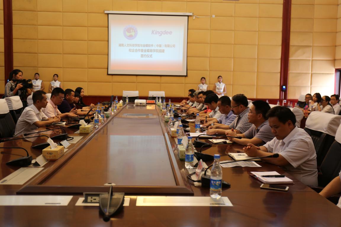 7月11日,学校首家行业学院——金蝶商学院工作推进会在图书馆一会议室举行。来自金蝶软件(中国)有限公司总裁助理、金蝶湖南公司总经理胡奇一行及学校校长刘和云、副校长周发明、相关职能部门领导及商学院党政班子全体成员参加会议。会议由校地校企合作处处长黎建辉主持。