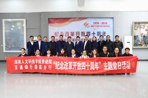 11月16日下午,美术与设计学院党总支与交通银行娄底分行第一党支部联合开展了“纪念改革开放四十周年”主题党日活动。交通银行娄底分行党委书记、行长陈碧华率党委委员兼行长助理邢英、肖飞腾等12人,太阳成官网党委委员、副校长周发明以及美术与设计学院党总支全体委员和下属支部书记参加党日活动。活动由美设学院党总支副书记易俊主持。