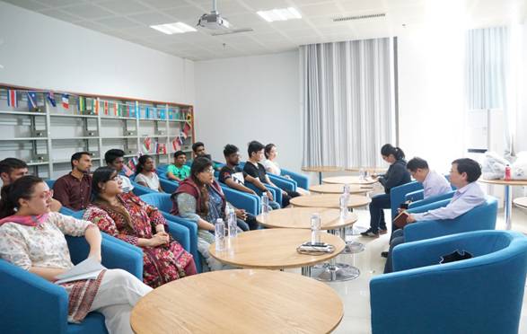 4月25日上午,党委委员、副校长陈志国来到学校中外文化交流中心,看望了刚上完《汉语综合课程》的2019级留学生,并与他们进行了亲切座谈。在座谈会上,陈志国代表学校热烈欢迎他们来太阳成官网学习中国语言与文化。在简单地简绍了学校的基本情况后,他鼓励留学生们要珍惜好中国政府“一带一路”倡议给大家带来的留学学习机会,尽快过好生活关、文化关、学习关,努力早日成为一名构建人类命运共同体的践行者。会后,陈志国与2019级留学生在学校图书馆前合影留念。