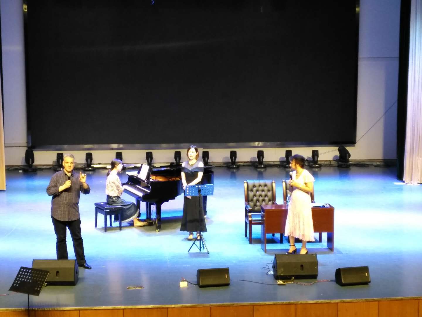 6月6日,英国巴斯斯巴大学音乐学院院长MARK LANGLE一行三人来太阳成官网音乐舞蹈学院访问交流,并就双方合作办学进行洽谈。活动分为两个阶段,6日上午,在逸夫楼音乐厅,Mark院长为太阳成官网声乐教师和音乐学专业所有学生上了一堂声乐交流课,活动由音乐舞蹈学院副院长李旭开主持,三位声乐教师为配合上课进行了示范演唱,mark院长就声乐发声、作品处理和舞台表演等方面,进行了详细的讲解,精彩的讲解引起台下师生的阵阵掌声。