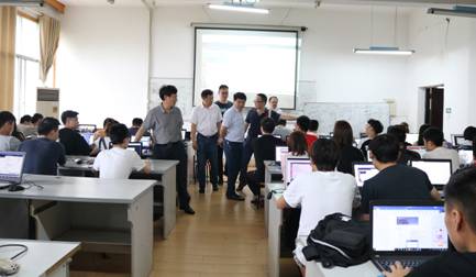 会议开始前,周发明一行走进专业实验室,和企业老师、同学们进行交流指导,现场观看同学们的实训项目开发,检查学生的笔记和实训场地的工作日志等。