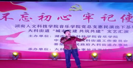 10月29日晚,由音乐舞蹈学院党总支部举办的“不忘初心、牢记使命”文艺汇演在娄底市娄星区大科街道办事处洪源社区举行。组织部常务副部长罗求实、机关党委书记刘纲华、宣传统战部副部长陈璐、音乐舞蹈学院党总支书记周邦春、副书记邓莉立、副院长吴扎拉·涛、副院长刘利连及洪源社区领导代表出席本次活动。音乐舞蹈学院全体师生党员及部分学生群众共同为洪源社区的父老乡亲们奉上了一台精彩的红色演出。