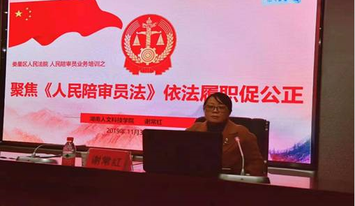 11月30日上午,娄底市娄星区人民法院组织2019年度初任人民陪审员任前培训,法学院副教授谢常红老师应邀授课,来自全区149名初任人民陪审员参加了本次培训。