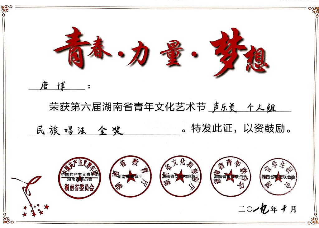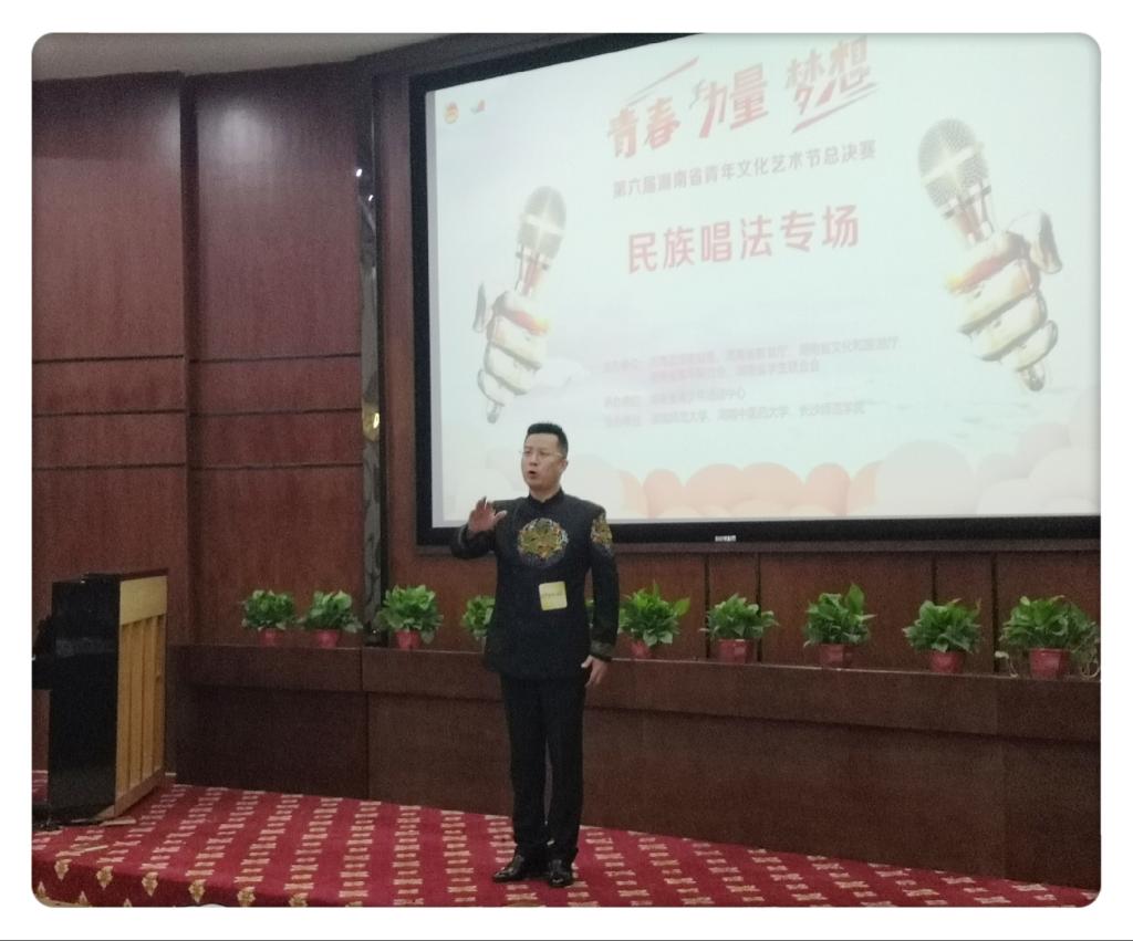 近日,在由共青团湖南省委、湖南省教育厅、湖南省文化和旅游厅、湖南省青年联合会、湖南省学生联合会共同举办的“第六届湖南省青年文化艺术节”中,太阳成官网音乐舞蹈学院声乐教研室主任唐博副教授以全省第二名的成绩,荣获声乐类个人组“民族唱法金奖”。