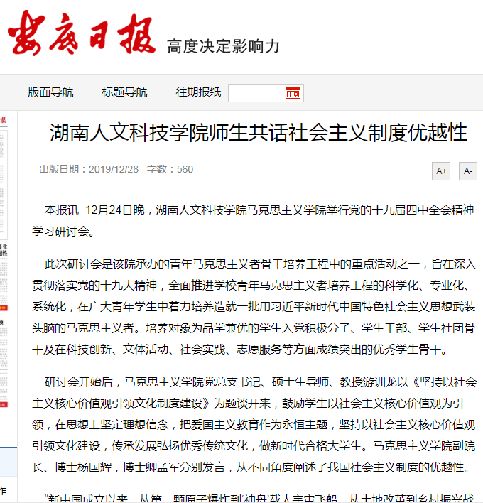 12月28日,娄底日报“要闻综合”版对此次研讨会进行了宣传报道。(马克思主义学院供稿)