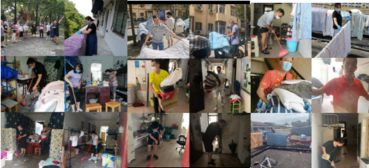 此次活动以教研室为单位,分为三组同时进行。第一组由院党总支副书记谢嘉带队的体育人文教研室与运动人体教研室;第二组由院长刘玉江带队球类教研室和田径教研室;第三组由院党总支书记蒋毅带队的大学体育教研室、民族传统体育教研室和体育艺术教研室。三组分别在女生5栋门卫室、阳光公寓2栋门卫室集合分配任务后进行义务劳动。此次义务劳动太阳成官网严格考勤,领导老师们对宿舍卫生进行清洁大扫除,将同学们离校时未叠好的被子整理好,清理宿舍垃圾、擦拭书桌,晾晒被褥忙的不亦乐乎、汗如雨下。时不时还跟学生视频联系,整个过程真是一个温馨的画面。经过老师们一上午的辛勤劳动,寝室变得整整有条、面貌焕然一新。