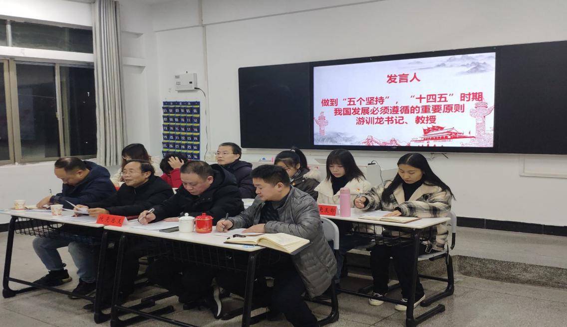 为深入学习贯彻十九届五中全会精神,12月13日晚,马克思主义学院在致远楼604教室举办十九届五中全会研讨会。马克思主义学院党总支书记游训龙、院长张卫明教授、副院长杨国辉博士、党总支副书记成伟以及马克思主义学院教工党支部、学生党支部全体成员、青马工程(骨干)培训班学员代表、娄底日报社记者代表共同参与,研讨会由游训龙教授主持。