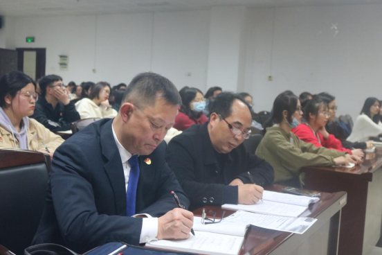 李蓉教授围绕百年辉煌与初心使命这个主题,从中国共产党名称的确定、党组织的发展壮大、自我革命、党组织的先进个人、抗日救亡的斗争以及带领人民走向胜利等方面对党的历史作了较为全面的线性梳理,对中共党史、党的信仰、党领导的必要性和重要性等问题作了深入的分析。随后从党如何解决党内曾经出现过的问题,和党如何化解党组织所面临的的危机两个方面系统的论证了党是如何发展、变化的,也证明了党具有先进性、纯洁性和自我革命性。最后,李蓉教授引用习近平主席讲的九个字来勉励到场的人员:“政治强、业务精、作风正”。李蓉教授在报告中严谨的论证、丰富的学识和富有力量的语言都给党员同志和学生留下了深刻的印象。