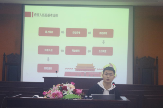 退役士兵代表唐振宁从入伍的条件、基本流程、国防意义、当兵的好处、优惠政策、征兵时间及报名地址等方面为同学们进行了详细讲解。同时,他从亲身经历出发,分享自己军旅生涯的心得体会,用鲜活的事例展现了军人的血性担当,诠释了军人的家国情怀与战友情谊,进一步激发广大青年学子积极投身国防建设的热情。