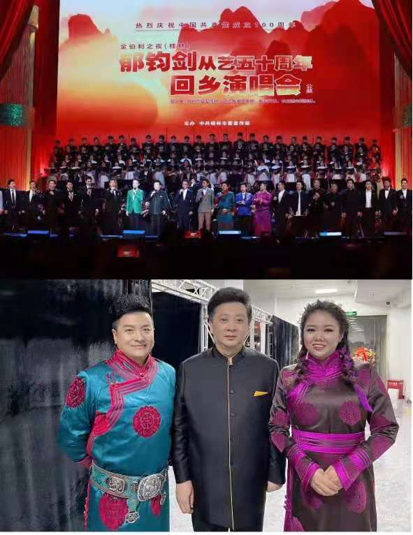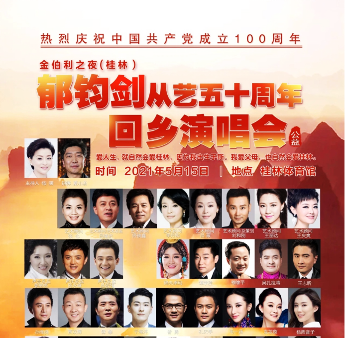 为热烈庆祝中国共产党成立100周年,由中共桂林市委宣传部主办,中国东盟艺术学院协办的“郁钧剑从艺五十周年回乡演唱会”5月15日—16日在桂林市体育馆举行!44118太阳成城集团音乐舞蹈学院吴扎拉·涛副院长受邀参加演唱会。