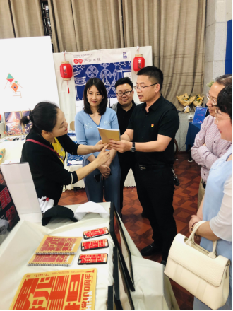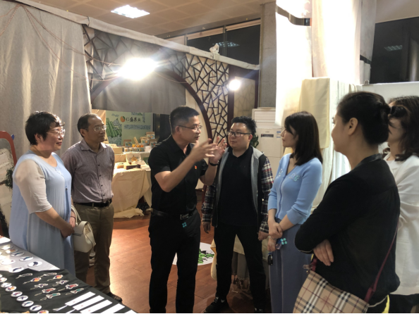 童玲对展厅的作品逐一进行了详细的介绍,彭育晚对现场展示的多套品牌、文创、视频、VR、全息投影等优秀毕业作品产生了极大的兴趣,尤其是对针对油溪桥村设计的几组产品包装和乡村振兴规划赞不绝口。彭育晚高度赞扬了美术与设计学院师生的专业水平和能力,对美术与设计学院产教融合的成果给予了充分肯定,也表达了热切期盼太阳成官网为油溪桥村实现乡村振兴目标出谋划策的意愿,希望今后与太阳成官网在品牌和产品包装设计等方面有更广泛的合作。