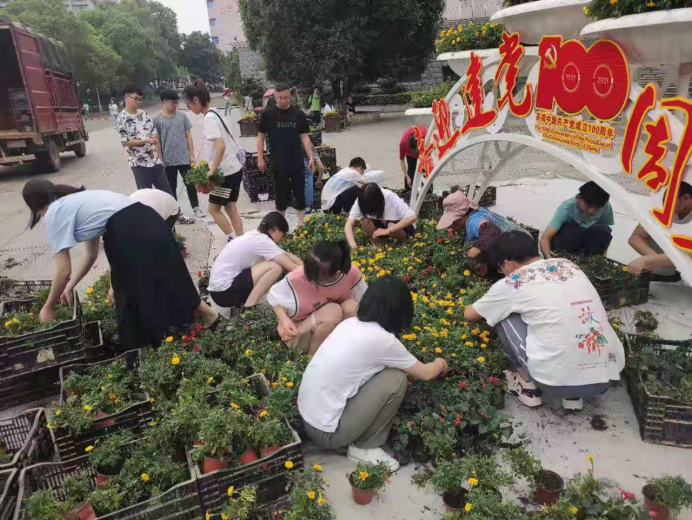 上午9时整,在园艺专业实践教学课程组老师们的指导下,同学们以班级为单位展开行动。园艺一班负责东珠大道两侧、学海路旁、匠成楼前,园艺二班负责翠竹路、宇光球场旁防腐木箱更换盆景、草花,栽上三角梅和四季海棠。然后,两个班的同学联手在图书馆前坪打造“喜迎建党100周年”模纹花坛,该花坛长7.8米,宽5.2米,中间的彩虹钢架托起5盆鲜花辉映“喜迎建党100周年”主题徽标,长方形花坛选用一串红、万寿菊、满天星等具有饱满色彩的花卉品种,衬托出立体彩化景观,烘托浓烈的节日喜庆气氛。活动中,同学们将学党史、悟思想的成果转化到用实际行动庆祝党的100周岁生日中,争着干、抢着干,呈现出你不让我、我不让你,互帮互助的热火朝天场面。活动至下午6时许才结束。