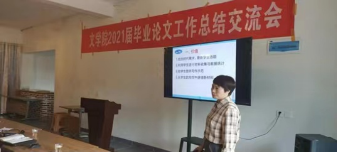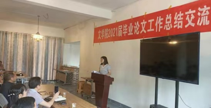 彭玲博士指导的毕业论文,在规范化方面堪称文学院的榜样,她做了毕业论文程序规范化发言,对毕业论文如何做到程序规范,提出了自己的见解;唐祖敏副教授为学生开了一门《毕业论文写作》课,他的讲话,例证丰富,充分阐述了毕业论文课程开设的意义;姜珍婷博士近年来致力于引导学生围绕自己的科研课题选题,她结合实例,着重谈了自己在这方面的做法与经验;纪忠璇老师则重点介绍了她组织学生线上答辩的经验;陈天佑老师今年成功地指导了一位学生毕业论文的替代性成果,他和大家分享了自己在这方面的做法与体会。