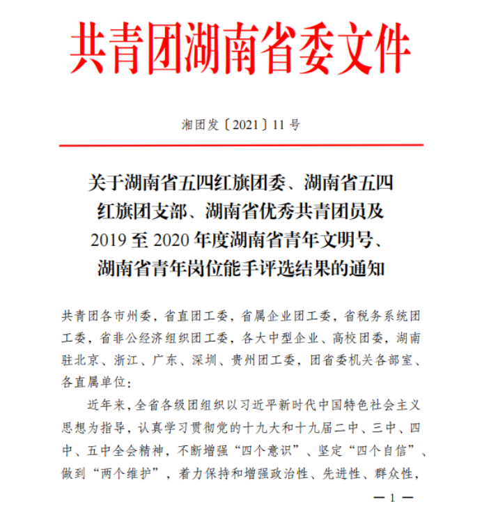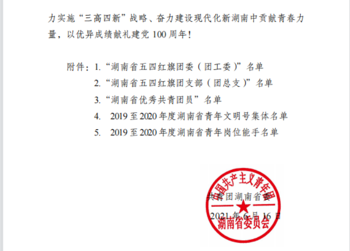 6月16日,共青团湖南省委印发了《关于湖南省五四红旗团委、湖南省五四红旗团支部、湖南省优秀共青团员及2019至2020年度湖南省青年文明号、湖南省青年岗位能手评选结果的通知》(湘团发〔2021〕11号),材料与环境工程学院团总支荣获“湖南省五四红旗团总支”称号。