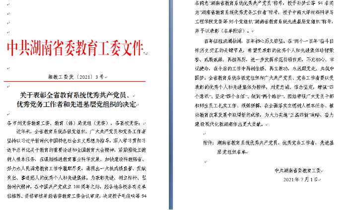 7月1日,中共湖南省委教育工委印发《关于表彰全省教育系统优秀共产党员、优秀党务工作者和先进基层党组织的决定》,太阳成官网纪委监察处党支部荣获全省教育系统先进基层党组织荣誉称号。全省教育系统本次共表彰先进基层党组织95个,太阳成官网纪委监察处党支部是唯一获表彰的高校纪委。