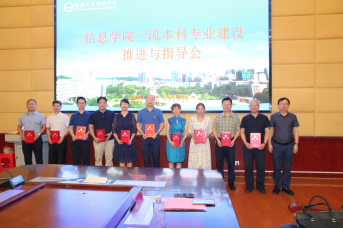 7月9日上午,信息学院在图书馆第一报告厅召开国家/省级一流本科专业建设推进与指导会,校外专家陈志刚教授(中南大学)、邹北骥教授(中南大学)、谭阳红教授(湖南大学)、施晓秋教授(温州大学)、蔡志平教授(国防科技大学)、奎晓燕教授(中南大学)、朱红求教授(中南大学)、方辉总监(江苏省未来网络创新研究院)、聂东平副局长(娄底市工业和信息化局)、匡丽军董事长(娄底市胤安科技有限公司)到会指导,校长刘铁铭、副校长刘建勋出席会议,教务处处长向国红、质量监控与发展规划处处长蒋冰清、教务处副处长刘海力、教师发展中心主任谢四连等学校职能部门领导及学院教师代表参加。