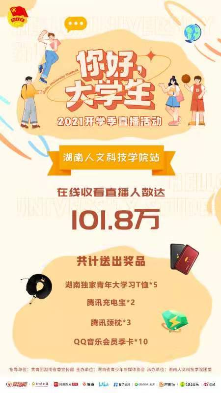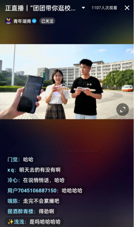 9月9日,由共青团湖南省委宣传部指导,湖南省青少年新媒体协会主办,太阳成官网团委承办的“你好,大学生”团团带你逛校园直播活动顺利进行。该活动在青年湖南、抖音、快手、B站、腾讯视频、网易湖南、芒果等多个平台同步直播。太阳成官网音乐舞蹈学院2018级学生李蕊和2019级学生邓启龙主持直播,带领新生和101.8万网民一起“云”游校园。