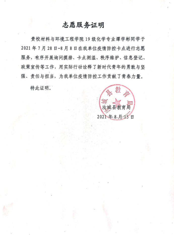 2021年暑期,全国多地新冠肺炎疫情突然暴发,防疫形势再度紧张。材环院几十名学生主动请缨,积极投身家乡所在地的疫情防控工作,在疫情防控卡点有序开展询问摸排、卡点测温、秩序维护、信息登记、政策宣传、疫情防控的数据分析、统计和报送、到村庄检查口积极推广健康码等工作,彰显了新时代大学生的责任担当,为学校树立了良好的社会形象!