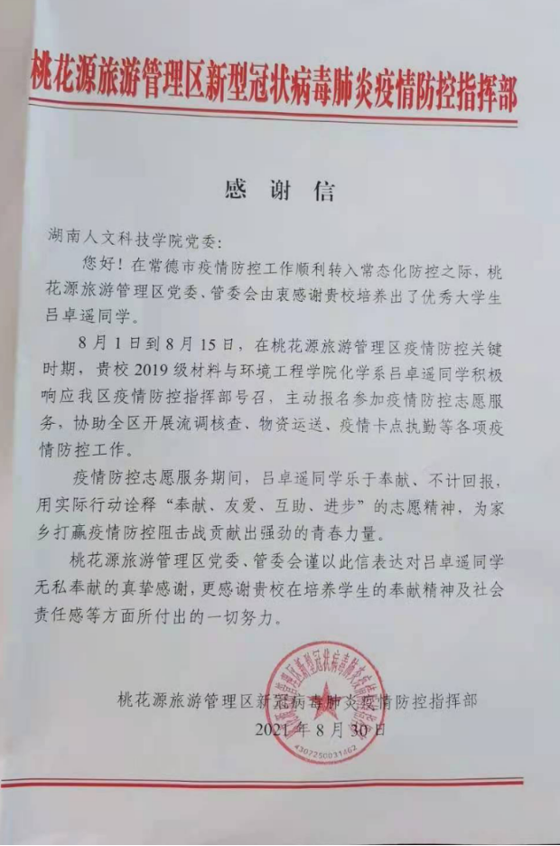 材料与环境工程学院紧紧围绕立德树人根本任务,坚持以理想信念教育为核心,以社会主义核心价值观为引领,以促进学生全面发展为导向,以为疫情防控做出重大贡献而评选为2021年湖南省“最美科技工作者”的陈庆平老师为榜样,着力推进“三全育人”,取得新成效。本学期开学以来,学院先后收到15地新冠病毒肺炎疫情防控指挥部发来的对材环学子的感谢信或表扬信。信中,对在常德桃花源旅游管理区主动报名参加疫情防控志愿服务,协助全区开展流调核查、物资运送、疫情卡点执勤等工作的化学专业2019级2班吕卓遥、在湘潭县易俗河镇瓦屋湾社区参加志愿者活动,被评为“最美志愿者”的材料科学与工程专业2018级1班周婧、在耒阳市第二人民医院临时接种点参与团市委疫苗接种志愿服务的材料科学与工程专业2019级1班林琳等同学主动加入志愿者服务队伍,为当地疫情防控工作所做的贡献表示感谢和赞扬,对材环院厚植学生爱国情怀、培育社会责任感方面的工作给予高度肯定!
