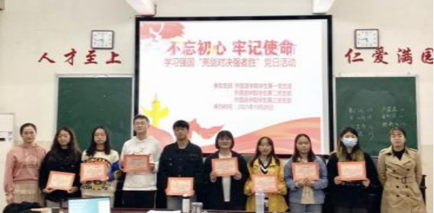 10月26日下午,外国语学院学生党支部于播馨楼406举行了“学习强国‘亮剑对决强者胜’”主题党日活动。学生党支部书记曹瑜虹、朱倩及外国语学院全体学生党员参加了活动。