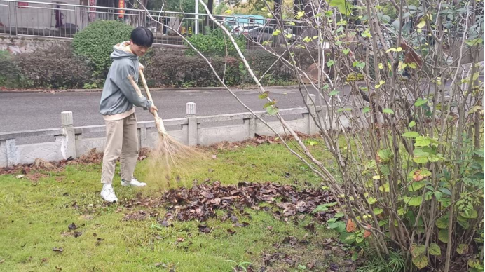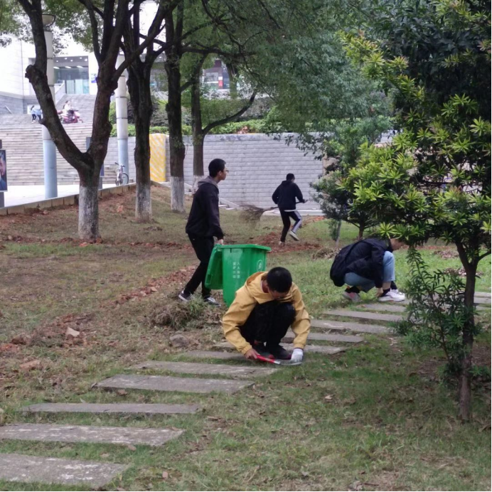 活动当天,气温低且下着绵绵细雨,同学们不但没有懈怠,反而更加积极热情,他们分工明确,互帮互助,一部分人负责捡着落叶、纸屑、烟头、塑料袋等杂物,一部分人负责修剪杂木枯枝,在合作中快速且高效地完成工作。活动中,原本陌生的同学也借此机会相互交流,熟悉亲近,收获了美好的友谊。