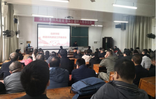 11月9日下午,信息学院召开师德师风建设工作推进会议,会议的主题是“加强师德师风建设 落实立德树人根本任务”。党总支书记谭甲凡主持,党总支副书记刘宗良作师德师风建设工作报告,学院全体教职工参加。