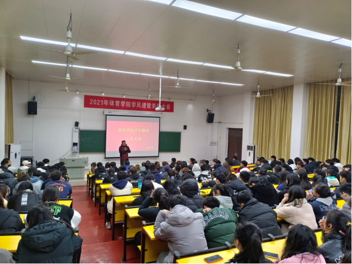 为加强疫情防控常态化期间学生管理工作,整顿期末考风考纪,提升学风建设质量,12月8日,体育学院在博达楼115教室召开2021-2022第一学期学生工作总结大会。院党总支副书记谢嘉、学工办主任周元玲、团总支书记徐红梅、招生就业专干闵婷及体育学院全体学生干部参加。