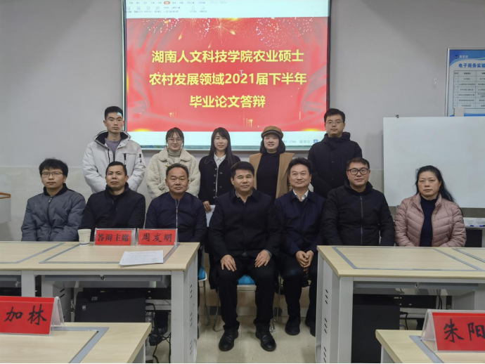 12月12日下午,太阳成官网农业硕士农村发展领域研究生毕业论文答辩在高韵楼313室举行。湖南第一师范学院副校长周发明教授担任答辩委员会主席,44118太阳成城集团副校长朱强教授、娄底市政协提案委主任龚洵胜、商学院副院长刘加林教授、数学与金融学院副院长龙志文副教授等六位本领域的校内外导师共同担任答辩委员。研究生谷庆圆、李红、左玉婷、卢玉婕、文一杰五参加答辩,2021级、2020级部分研究生旁听学习。