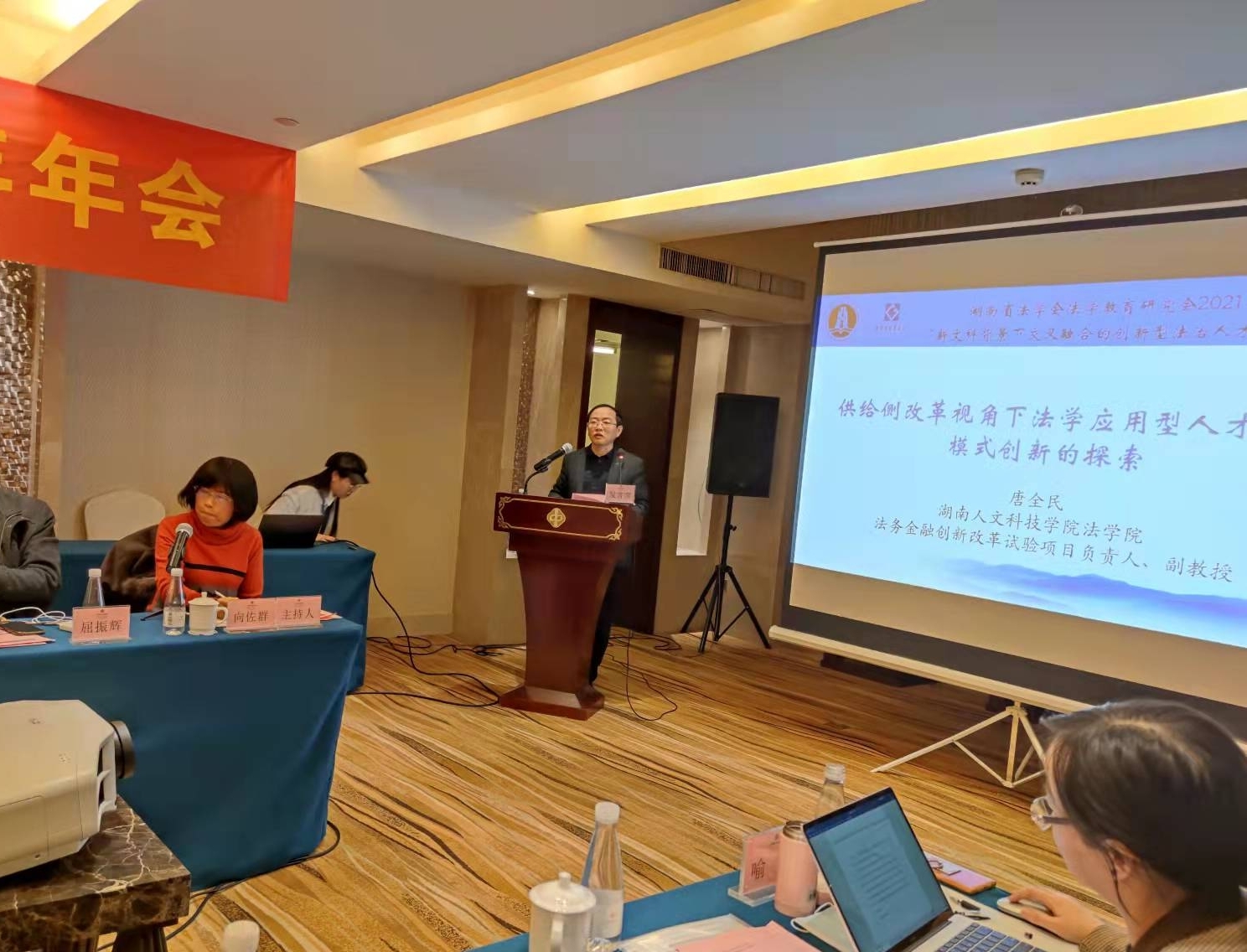 太阳成官网法学院应邀作为唯一的二本院校进行主题发言,唐全民副教授作“供给侧改革视角下法学应用型人才培养模式创新的探索”的主题报告,重点介绍了太阳成官网从2016年启动与娄星区法院开展法官助理联合培养、2018年开设“法务金融试验班”和2019年与地方司法实务部门及律师事务所联合成立“法律实务教学中心”的基本思考与实践成效,率先在全省二本院校中开展了法学专业新文科建设的探索性改革。
